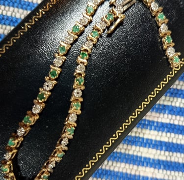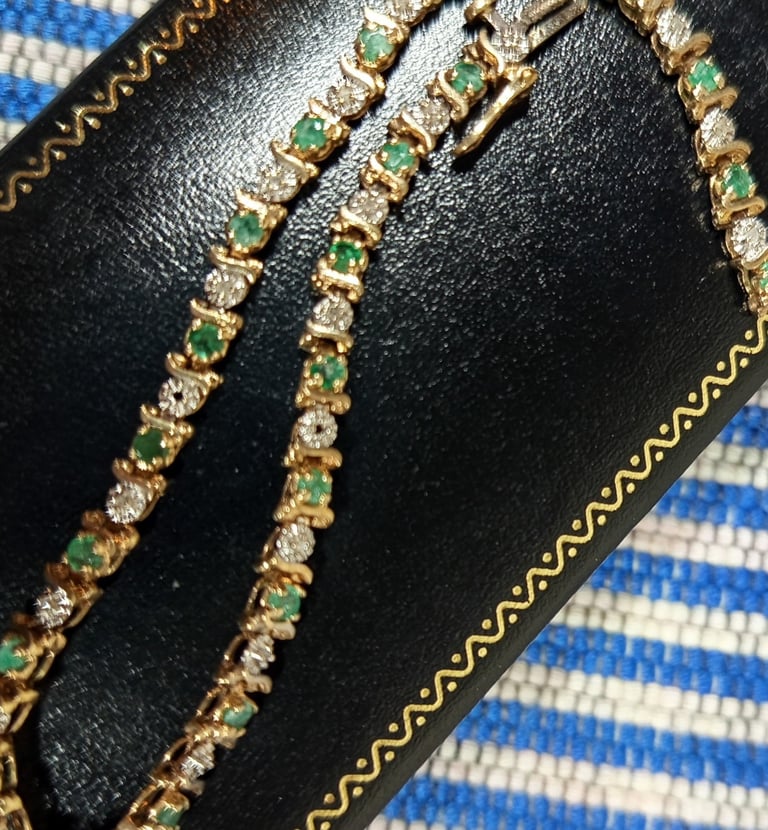 EMERALD AND DIAMOND BRACELET SET IN 18ct. YELLOW GOLD.