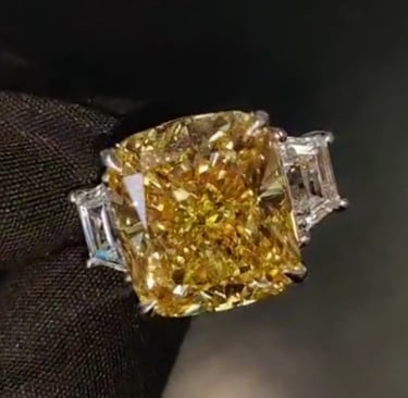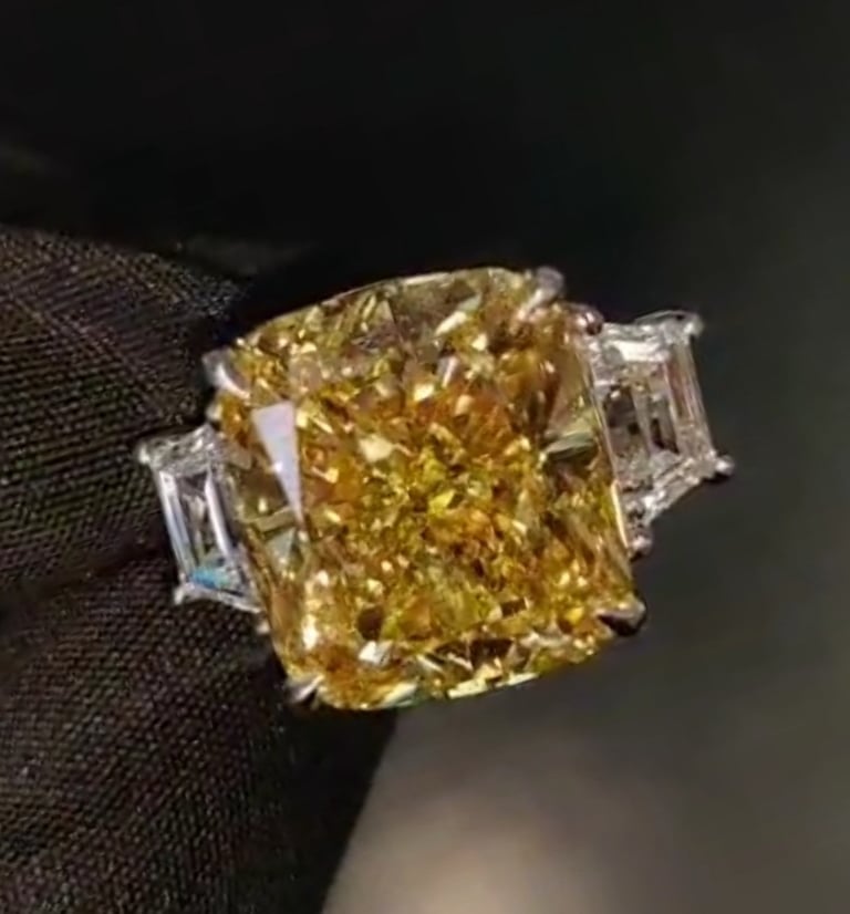 A RATHER LARGE CUSHION SHAPED YELLOW DIAMOND SET IN WHITE GOLD.